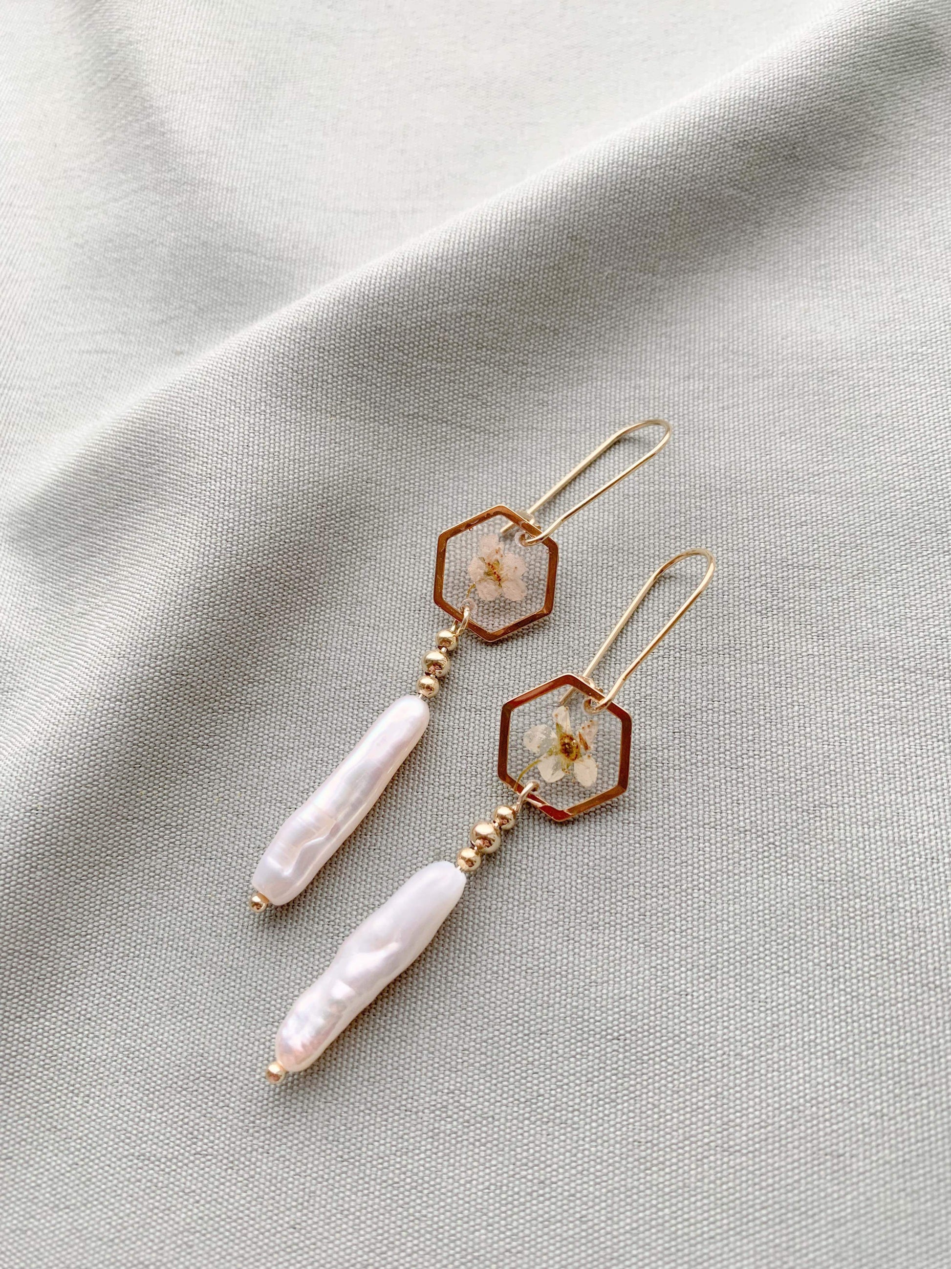 Indulge in timeless elegance with my personal favorite pair! 🌸✨ Delicate white blossoms grace a small hexagon bezel, creating an ethereal allure. The magic extends to a long baroque pearl, adding a touch of sophistication to these stud earrings. A blend of floral grace and the timeless allure of pearls, perfect for your everyday chic.