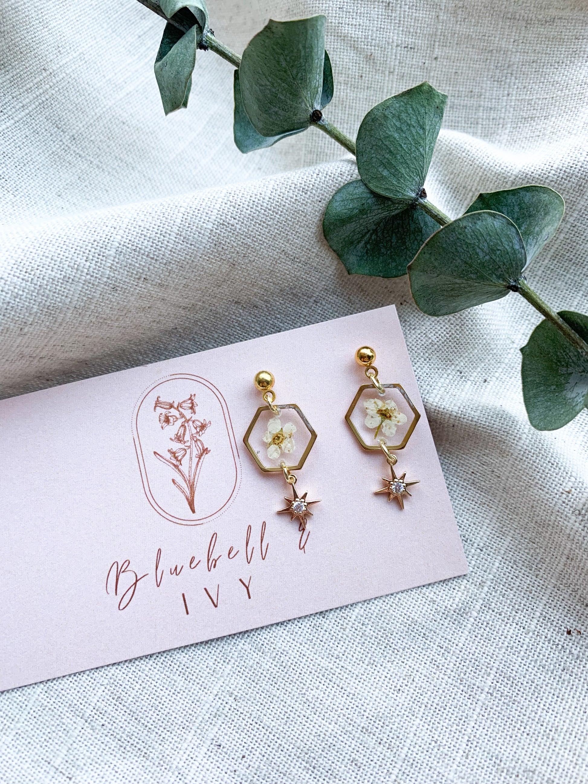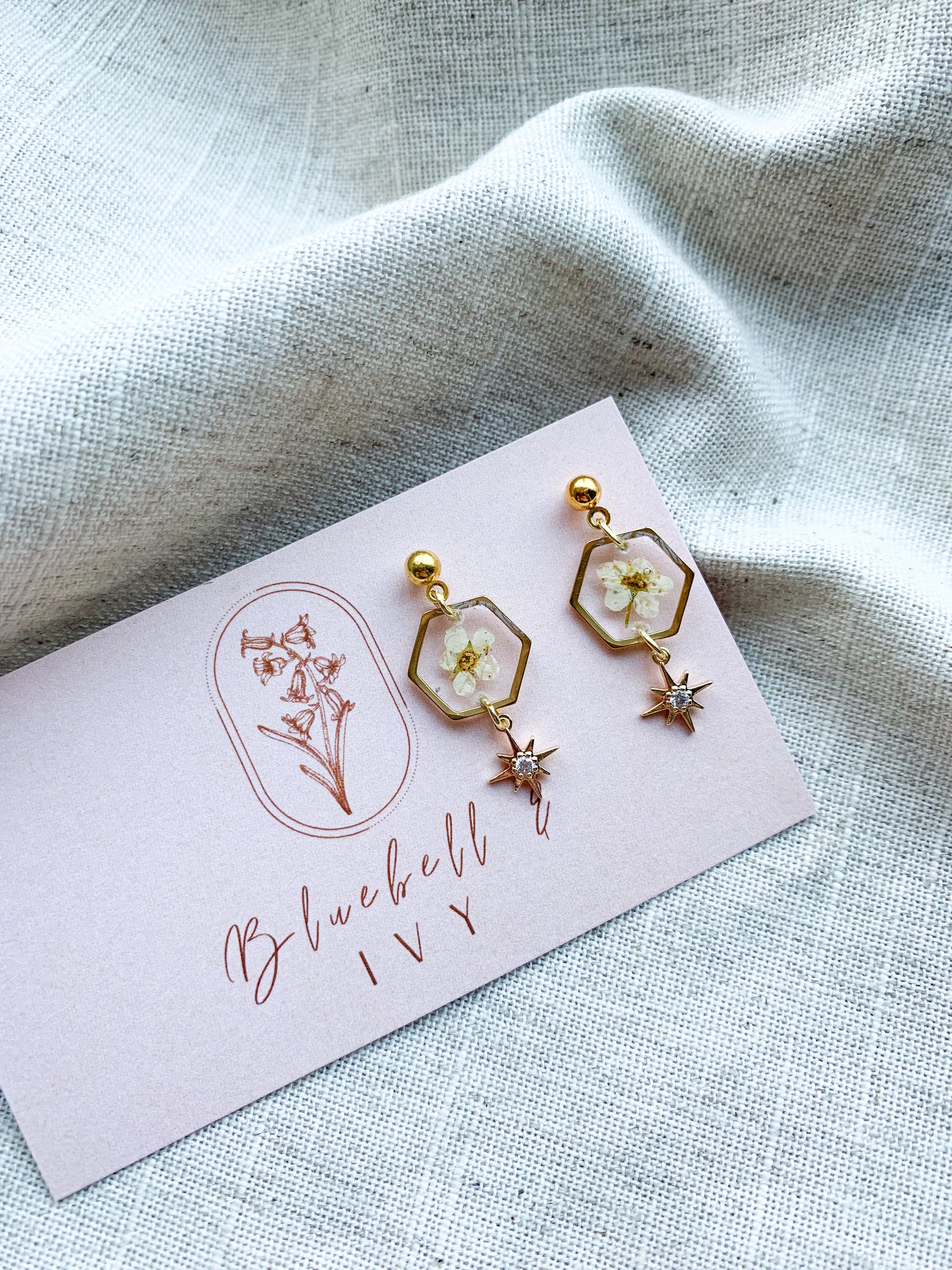 A tiny hexagon-shaped frame, like a secret window to a magical garden. Inside, you'll find a real dried blossom, captured in time, its delicate beauty frozen forever. As if that wasn't enchanting enough, a star-shaped dangle with shimmering gems adds a touch of celestial wonder to this already captivating piece. It's like wearing a little piece of stardust and nature's wonder on your ear, a true treasure for any dreamer! 🌼✨🌟