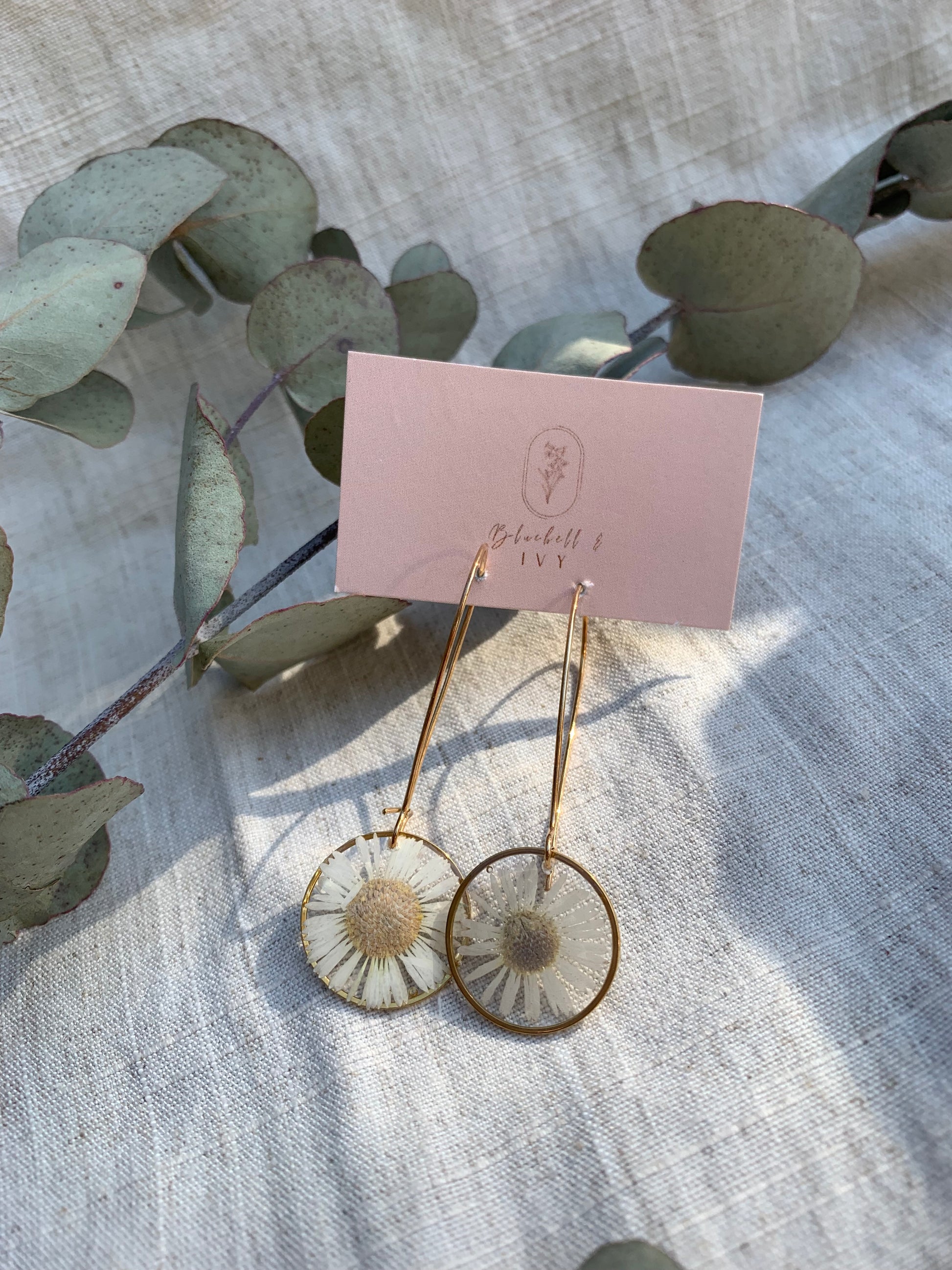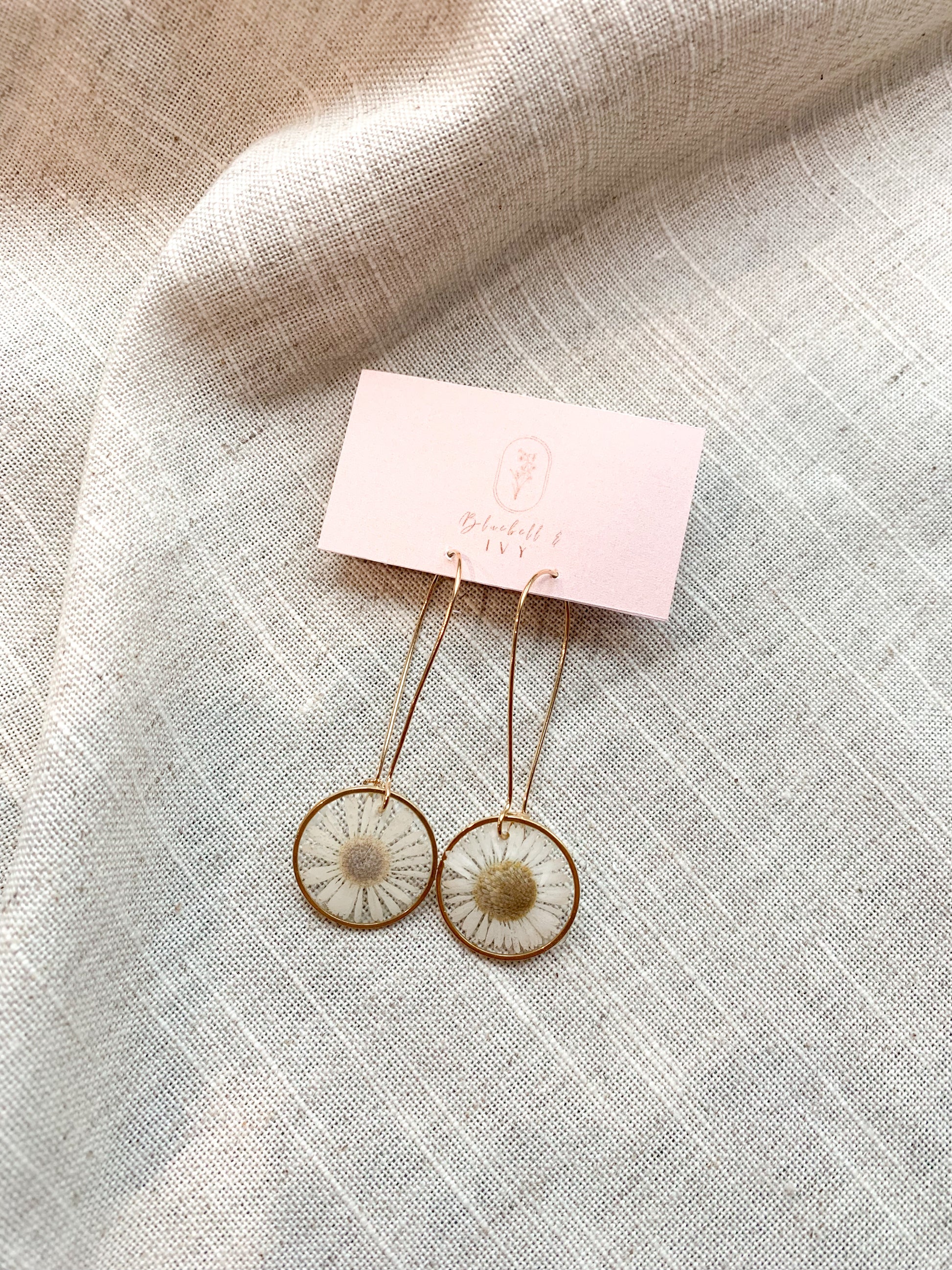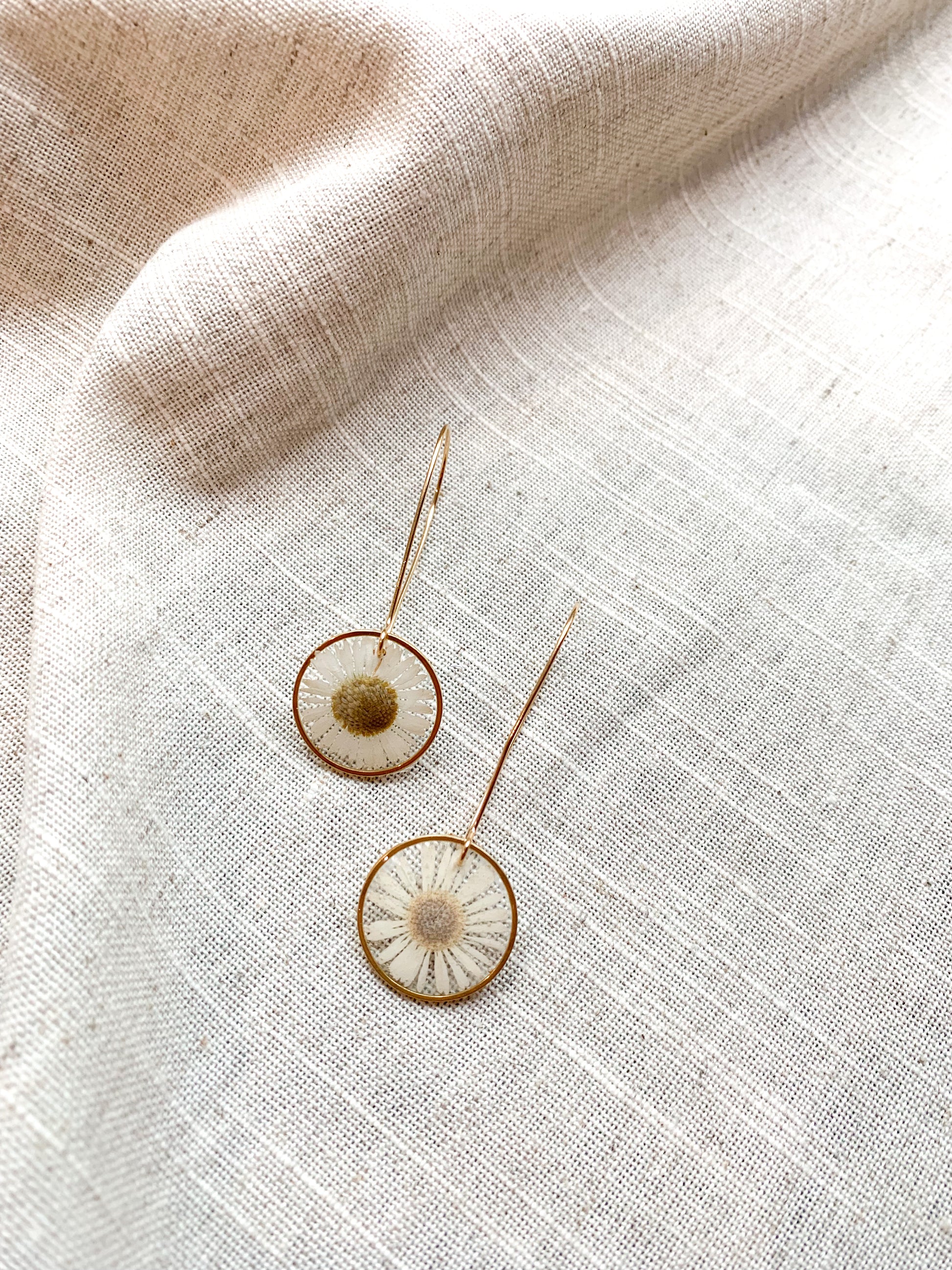 Each earring features a pristine white daisy, a symbol of pure beauty and simplicity, enclosed within the delicate gold frame. The long drop hooks add an extra touch of grace, creating an enchanting cascade effect with every movement.
