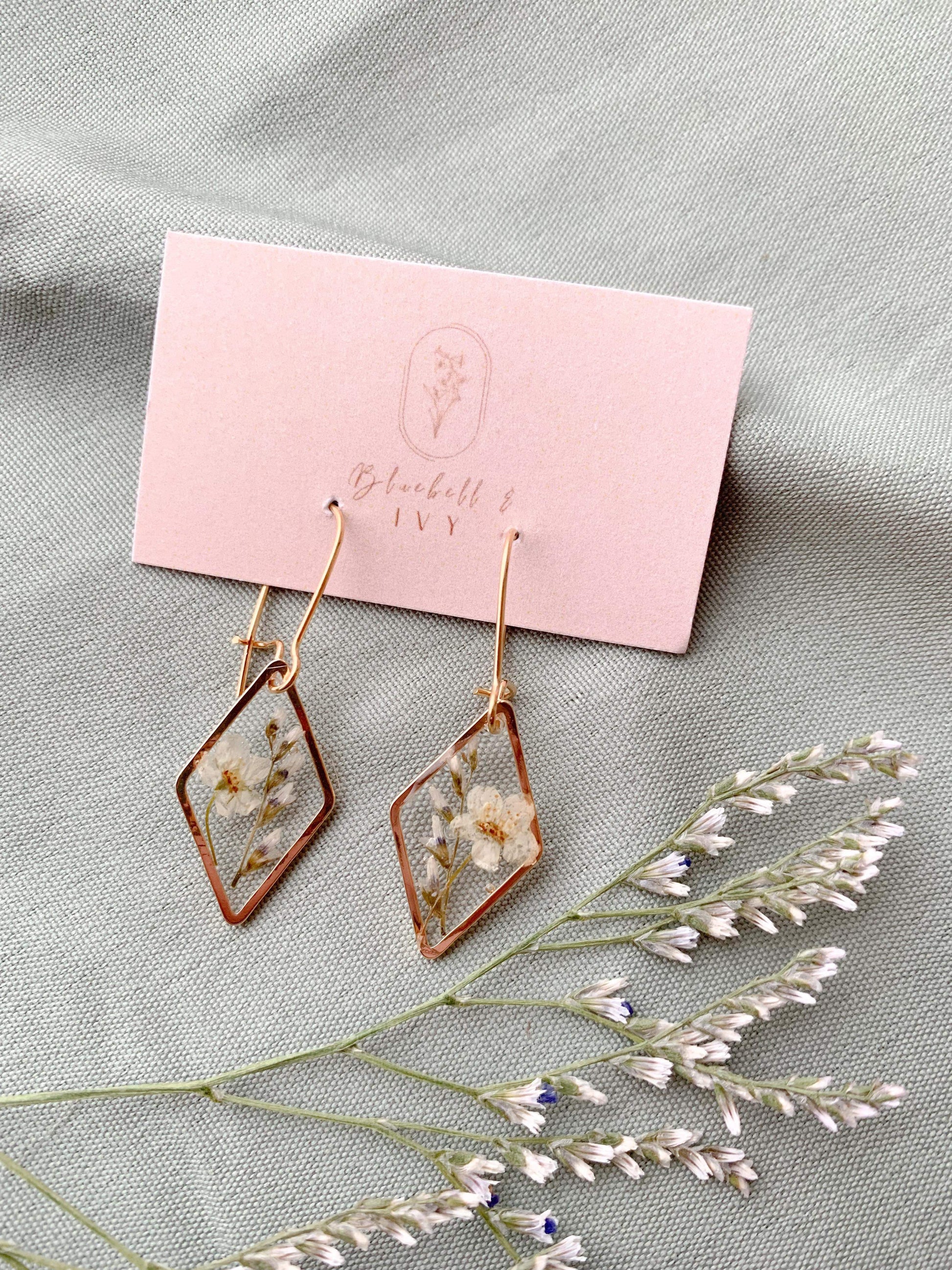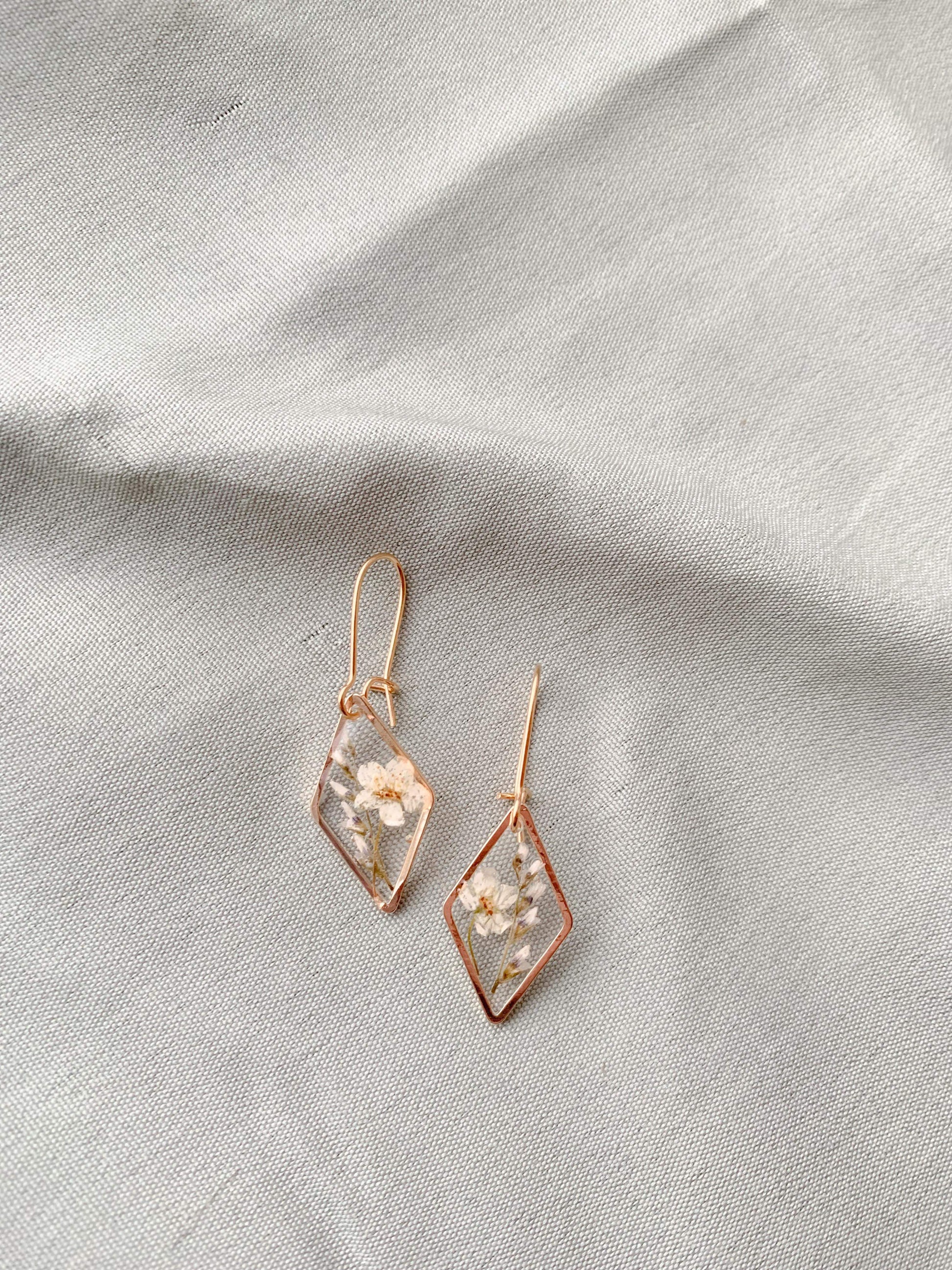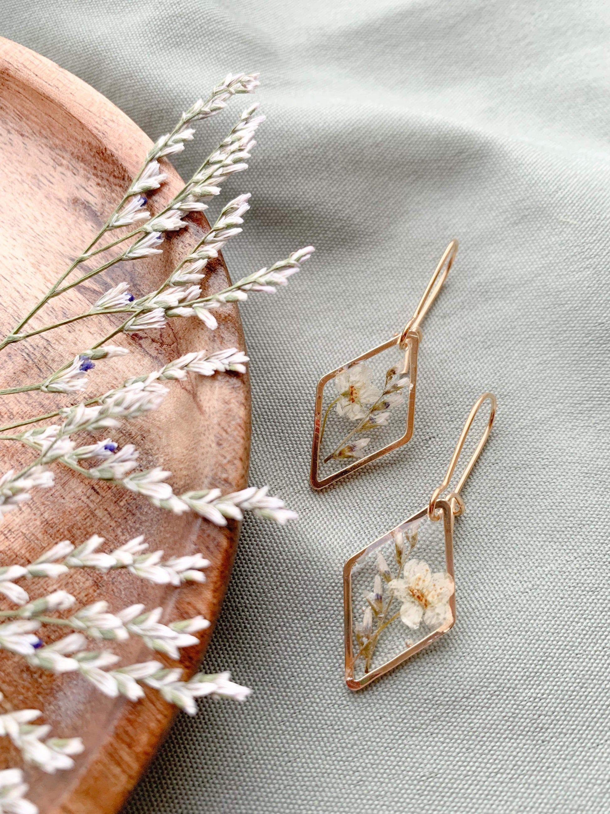 Our petite diamond bezel cradles the purity of white blossoms and delicate white limonium, creating earrings perfect for a bride.