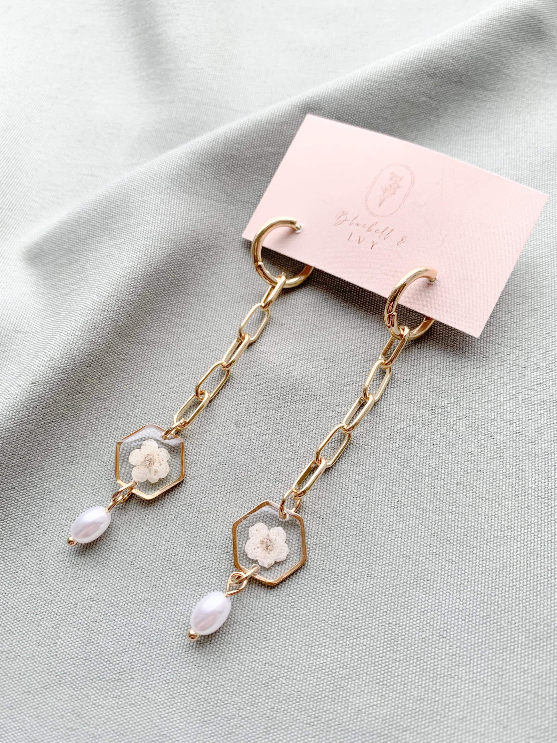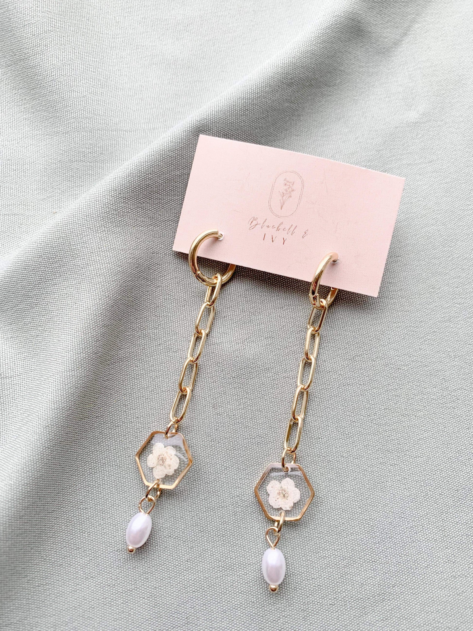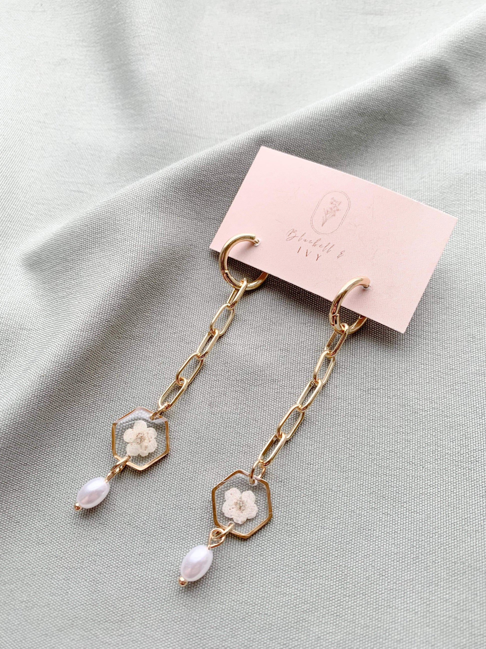 Step into a realm of enchantment with our hoop wonders! 🌸✨ Hanging delicately from an attached chain, these earrings culminate in a hexagon bezel cradling a single blossom, while a lustrous pearl dangles beneath. A harmonious blend of floral grace and timeless elegance.Â