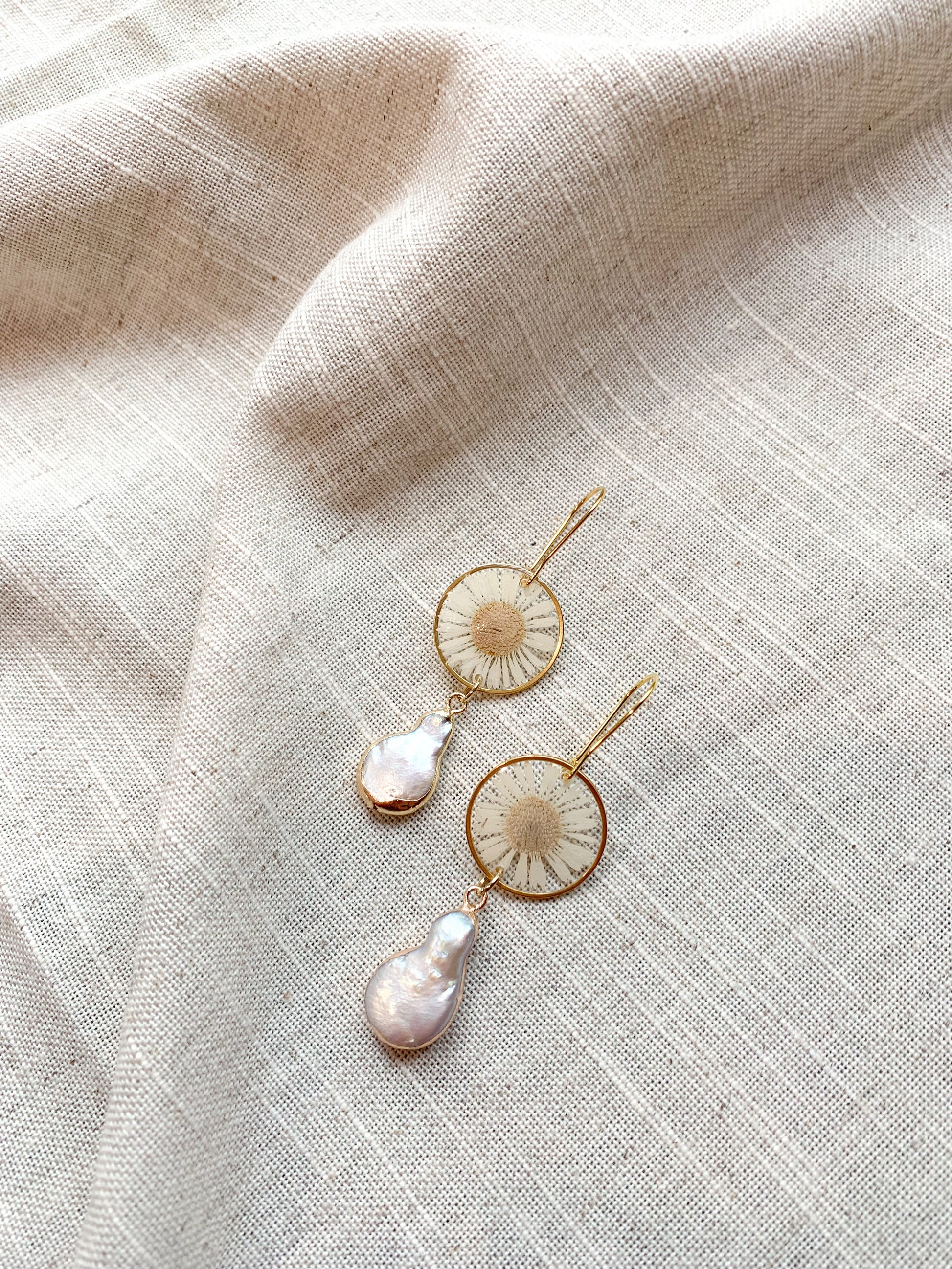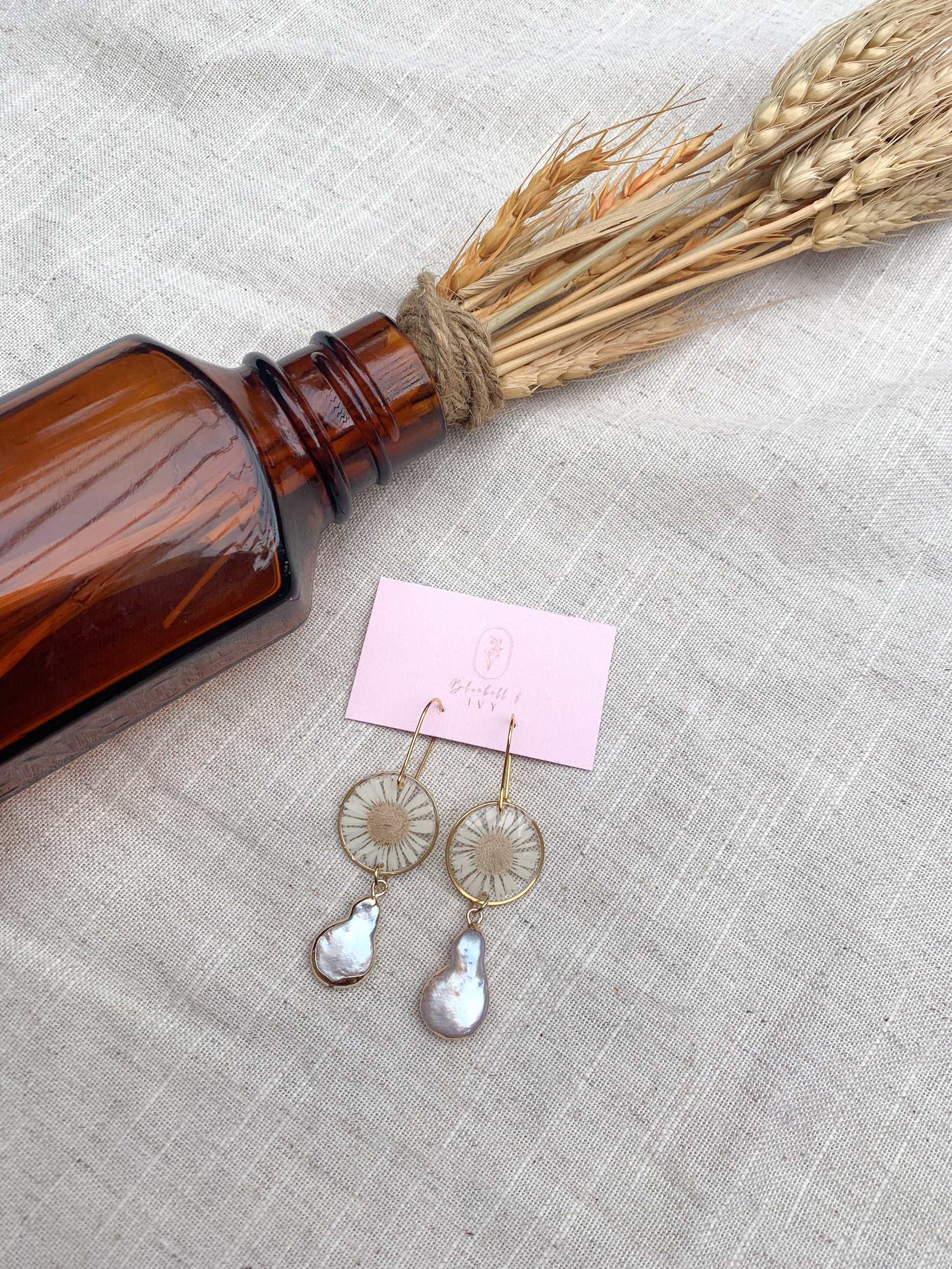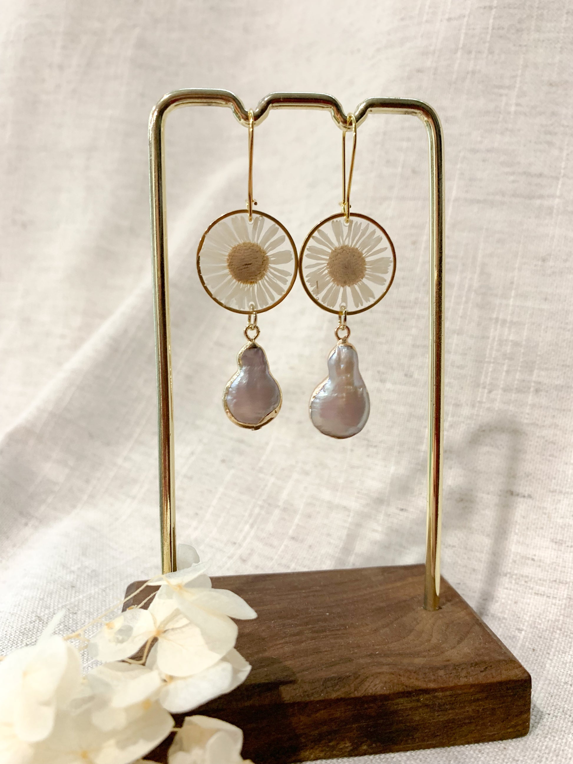A harmonious blend of classic charm and opulent beauty. These small circular gold-colored bezel earrings feature a pristine daisy at their center, framed by an exquisite large pearl embellishment with delicate gold-colored edging. Each earring showcases the simplicity and purity of a white daisy, capturing the essence of natural grace. The large pearl embellishment adds a touch of sophistication, with its golden edging adding an extra layer of luxury and refinement.