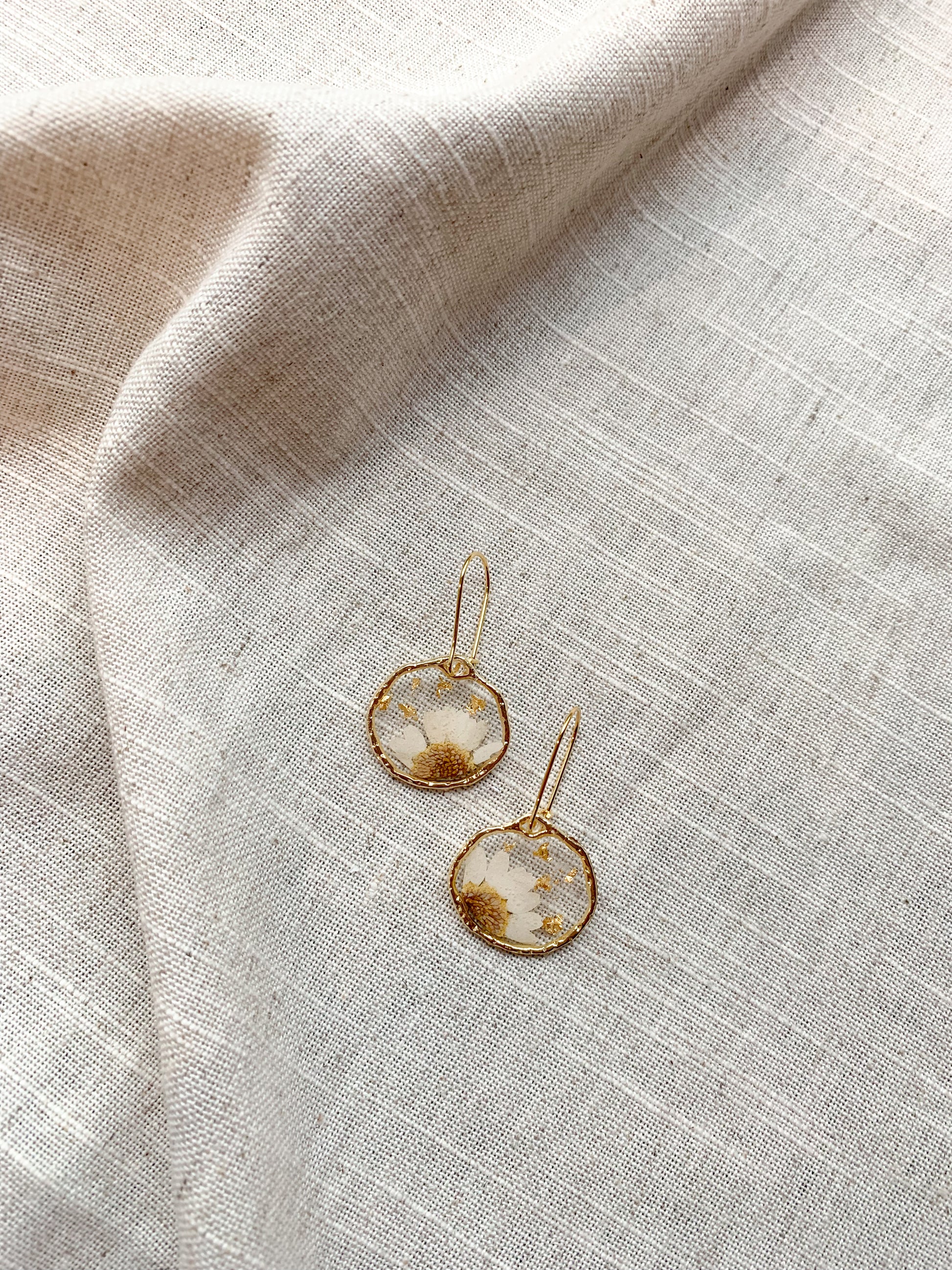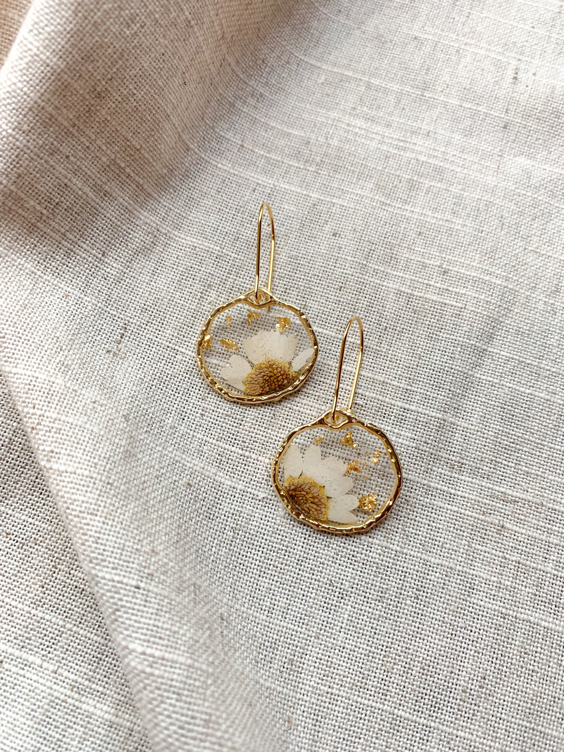 A pair of small, delicate earrings that embody the essence of elegance and simplicity. These earrings feature a charming small daisy delicately cradled within a gold-colored setting, adorned with shimmering gold leaf accents. Each earring showcases a pristine white daisy, a symbol of purity and natural beauty, framed by the gentle golden embrace.