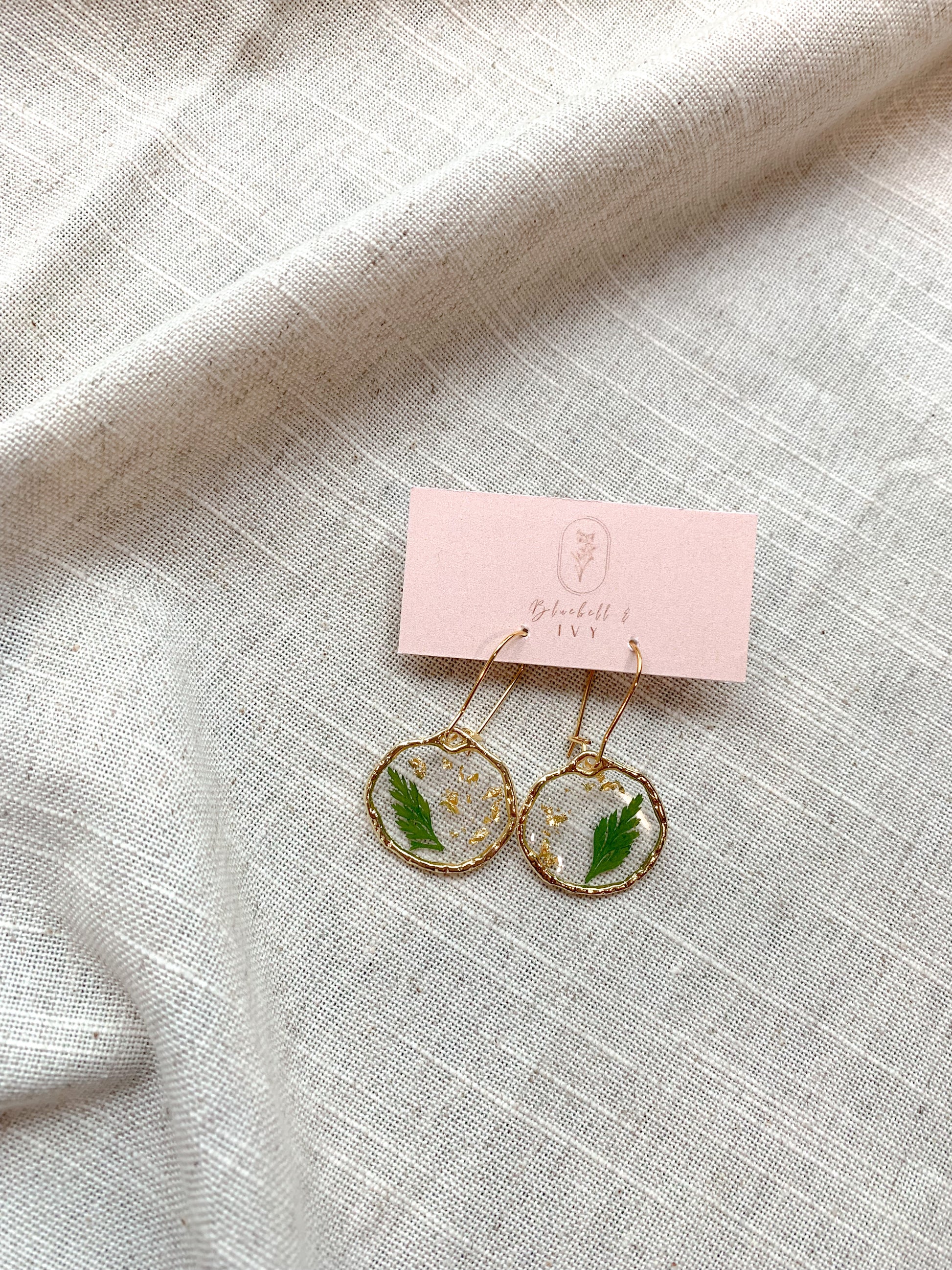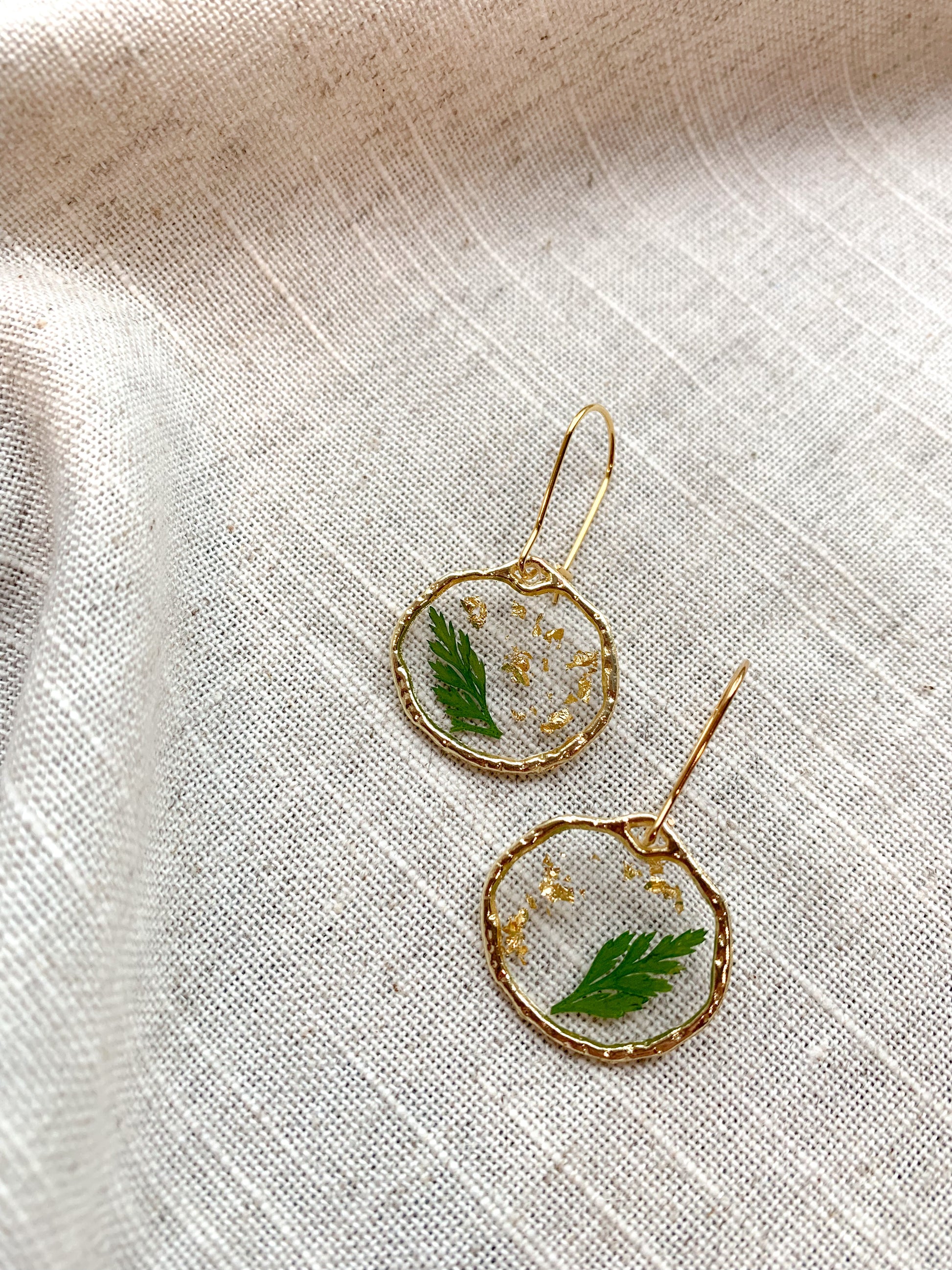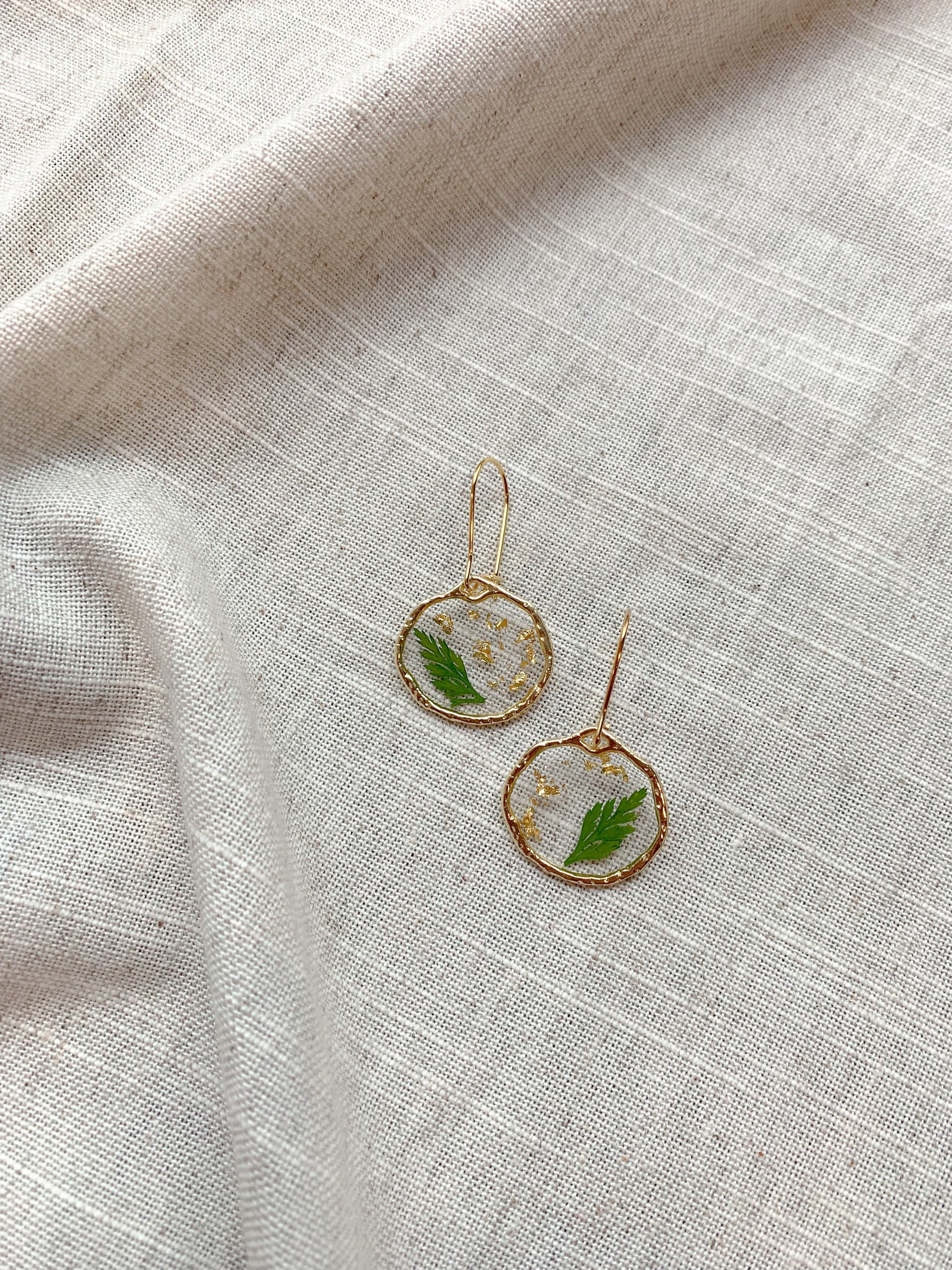 Imagine adorning yourself with "Golden Fern Whispers" and stepping into a world where ferns reveal their intricate charm under the golden sun. Each earring features a single, preserved fern frond nestled with gold leaf within a gleaming gold-colored bezel. Feel as though you're wearing a piece of a lush, sun-kissed forest close to your heart.