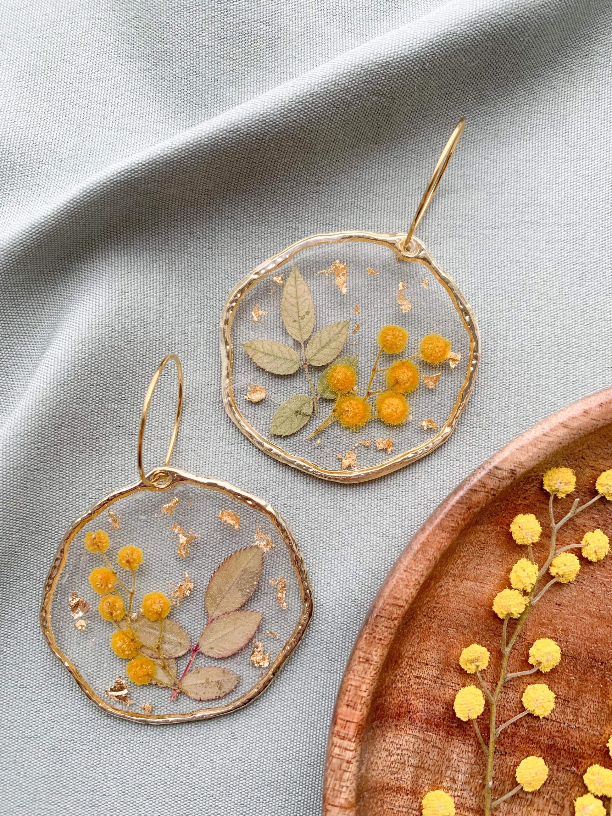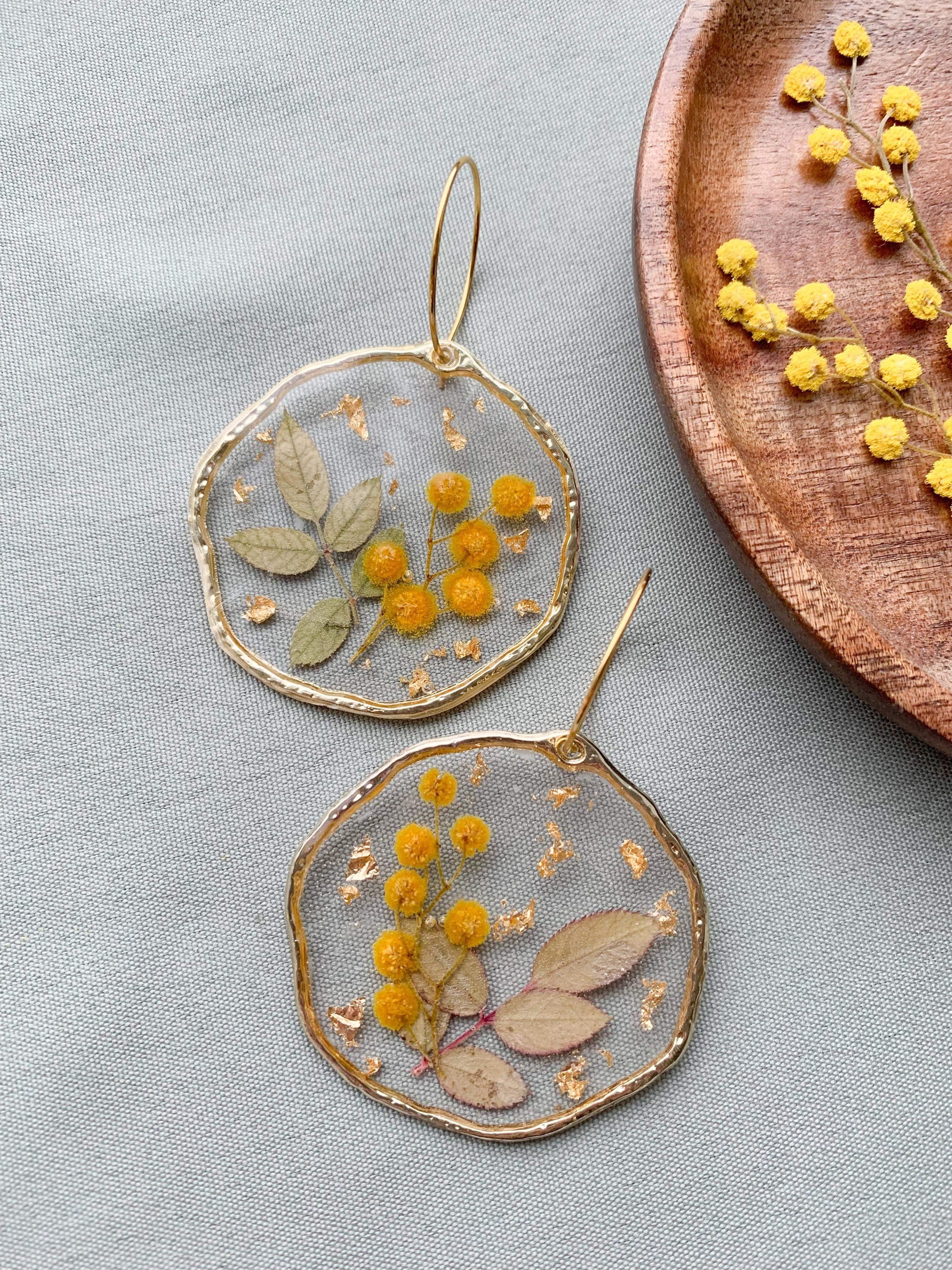 Step into a floral daydream with our enchanting earrings! 🌼✨ Encased in a gleaming gold frame, delicate wattle/mimosa flowers dance alongside petite rose leaves, all kissed by the shimmering touch of gold leaf magic.