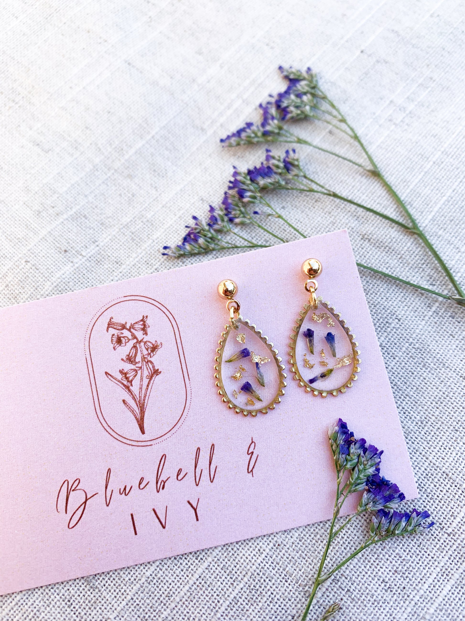 Teeny tiny pieces of purple Limonium nestled with a delicate scatter of gold leaf - framed by a beautiful gold coloured edged bezel.